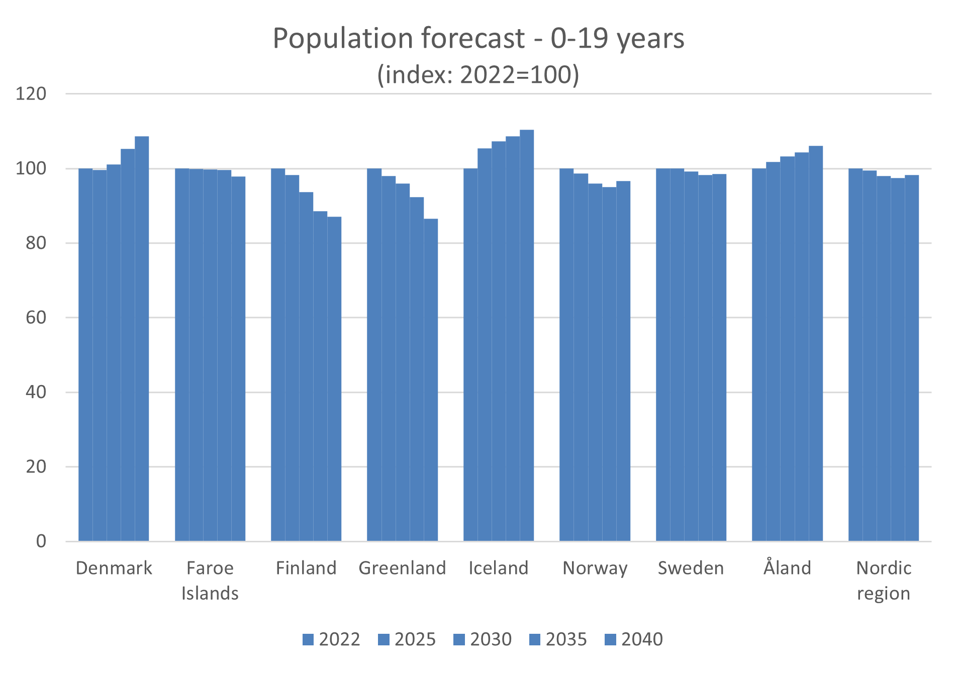 The group aged 0-19 years is expected to increase in Denmark, Iceland and Åland, while a decrease is expected for the other countries and regions.