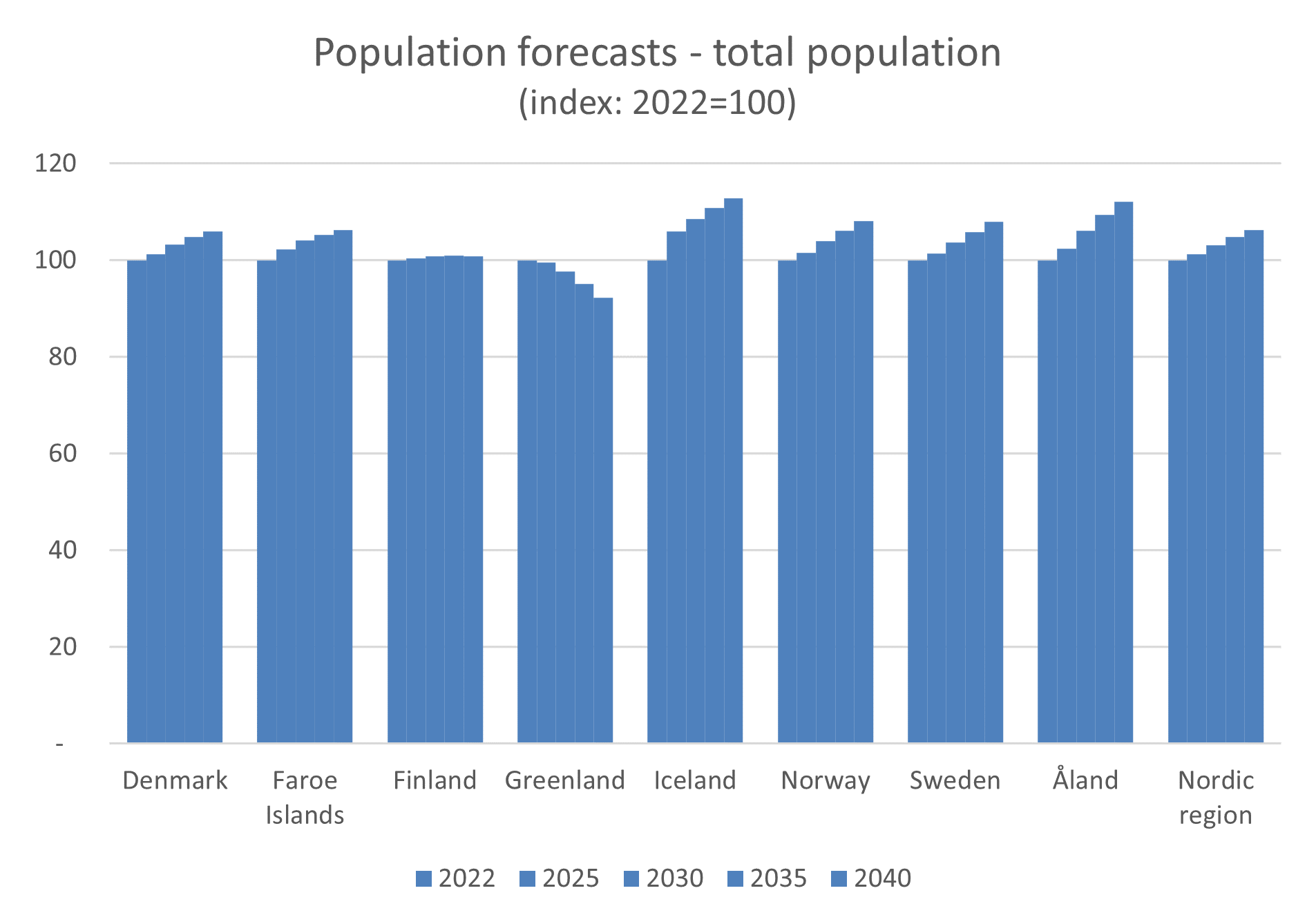 Population forecasts produced by national statistical institutes in the Nordic countries shows that, overall, it can be assumed that the Nordic region’s population will continue to grow over the next 20 years. However, the growth rate is expected to be lower than in the previous decade. Between 2022 and 2040 the population increase in the Nordic region as a whole is forecasted to just over six percent [2]. The diagram below shows the forecast development of the total population in each country, indexed by the year 2022 (the first forecast year) as a basis.