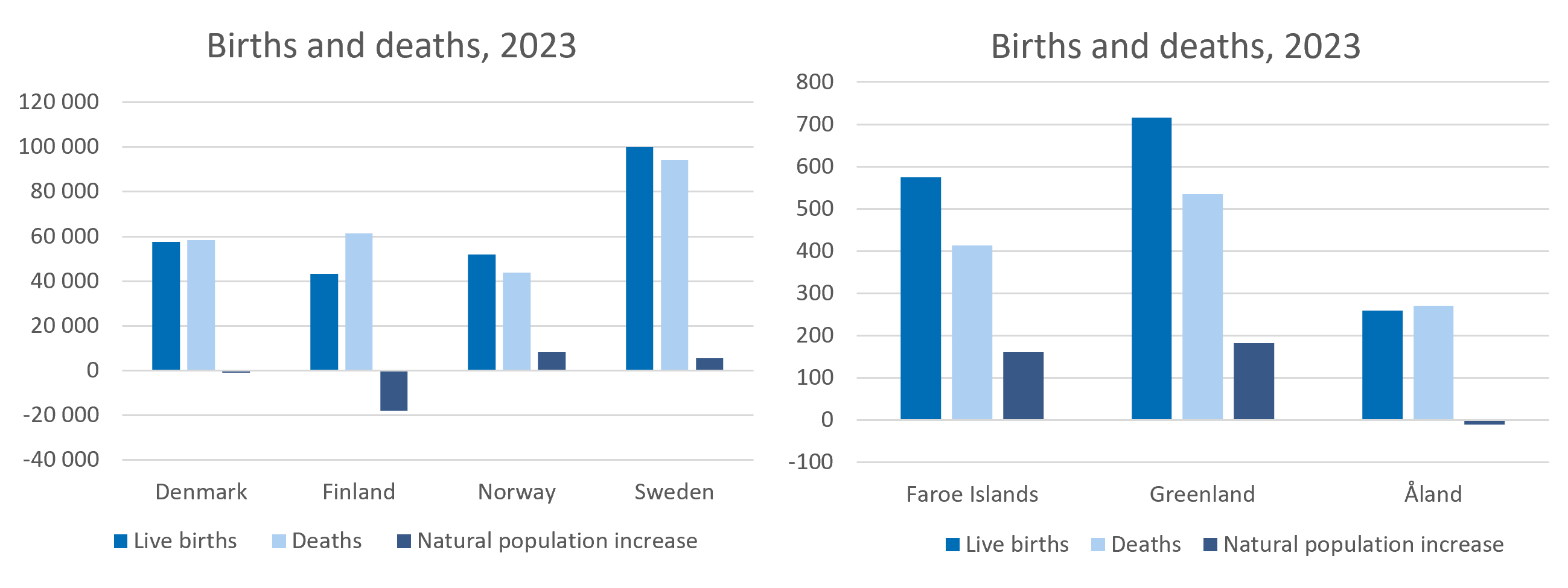 Three of the seven countries for which data on births and deaths are available for 2023 had a negative natural population increase, meaning more deaths than births. For Denmark and Åland, it was marginally negative, but for Finland it was significant, they had almost 18,000 more deaths than live births. Norway, Sweden, Faroe Islands and Greenland has positive natural population increase in 2023.