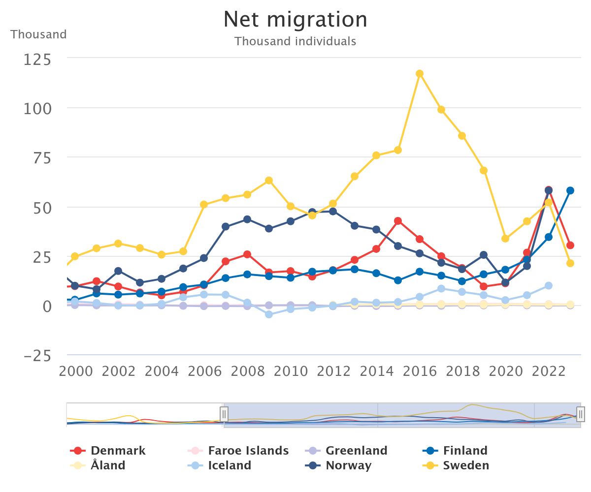 As mentioned above, Finland had almost 18,000 more deaths than live births, but this was offset by the fact that they had 58,000 more immigrants than emigrants. This is the largest net reported for Finland in the past 25 years, and almost 70% higher than the second largest net from 2022.