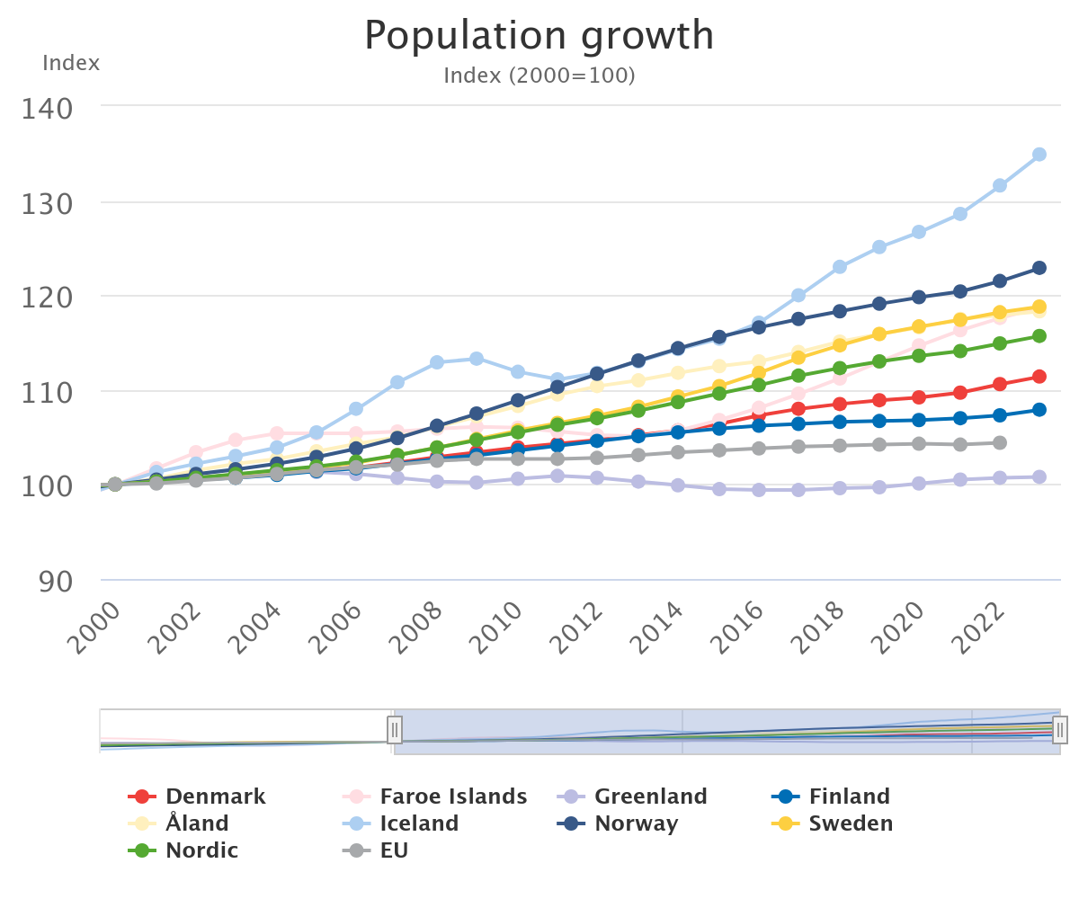 In the past two decades, all eight countries have had population growth, but the size of that growth varies. Compared with the year 2000, the population of Iceland has grown the most, it has increased by around 35%. The increase in Norway during the same period is 23%, in Faroe Islands, Sweden and Åland it is 19%, in Denmark 11%, Finland 8% and in Greenland 1%.