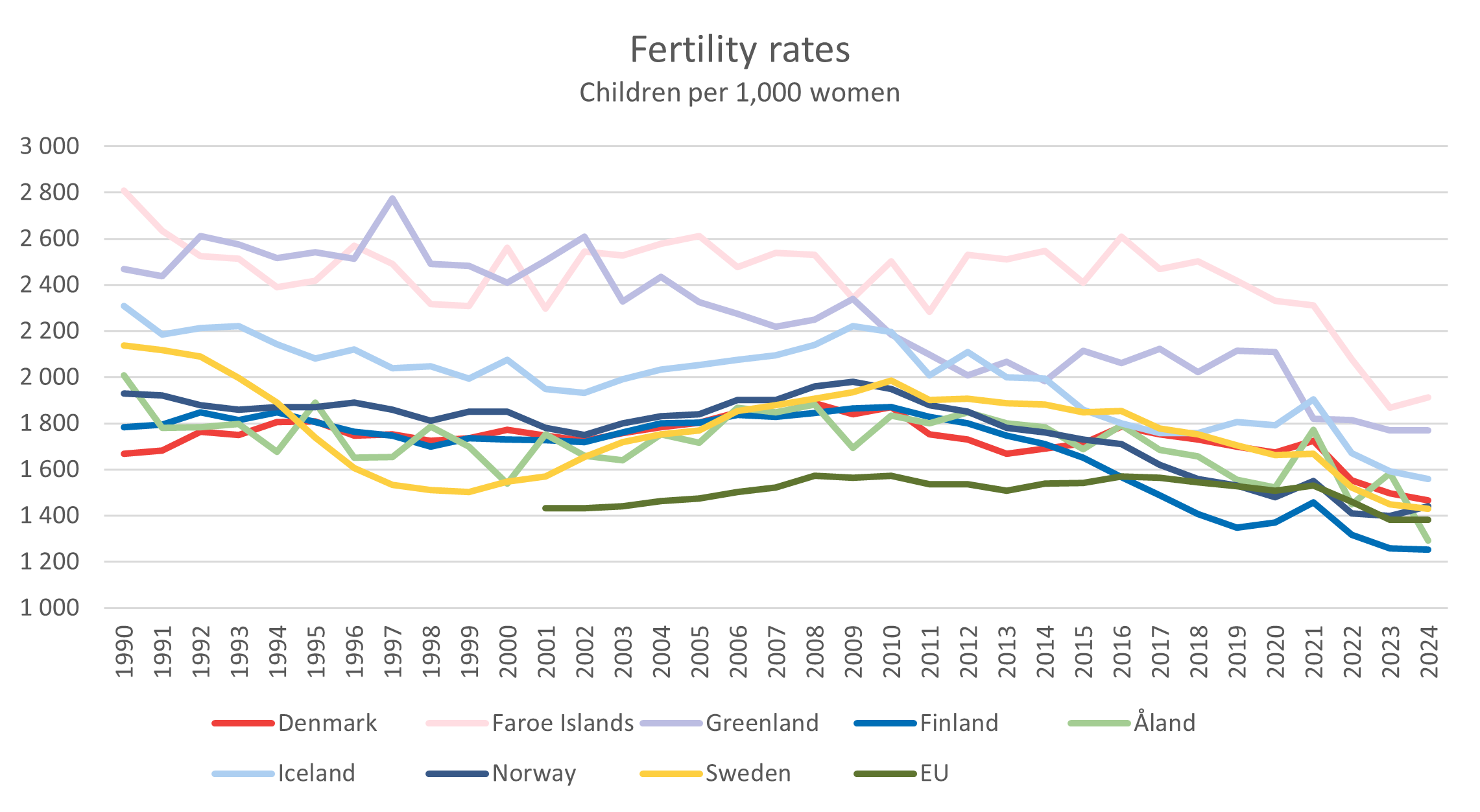 Since 2010, the total fertility rates have decreased in all countries: proportionally least in Greenland (-19%, 2023 value), followed by Denmark (-22%), Faroe Islands (-24%), Norway (-26%), Sweden (-28%) and Iceland (-29%). The largest decreases can be found in Finland (-33%) and Åland (-30%). In comparison, fertility in the EU has decreased by -12% over the same period.