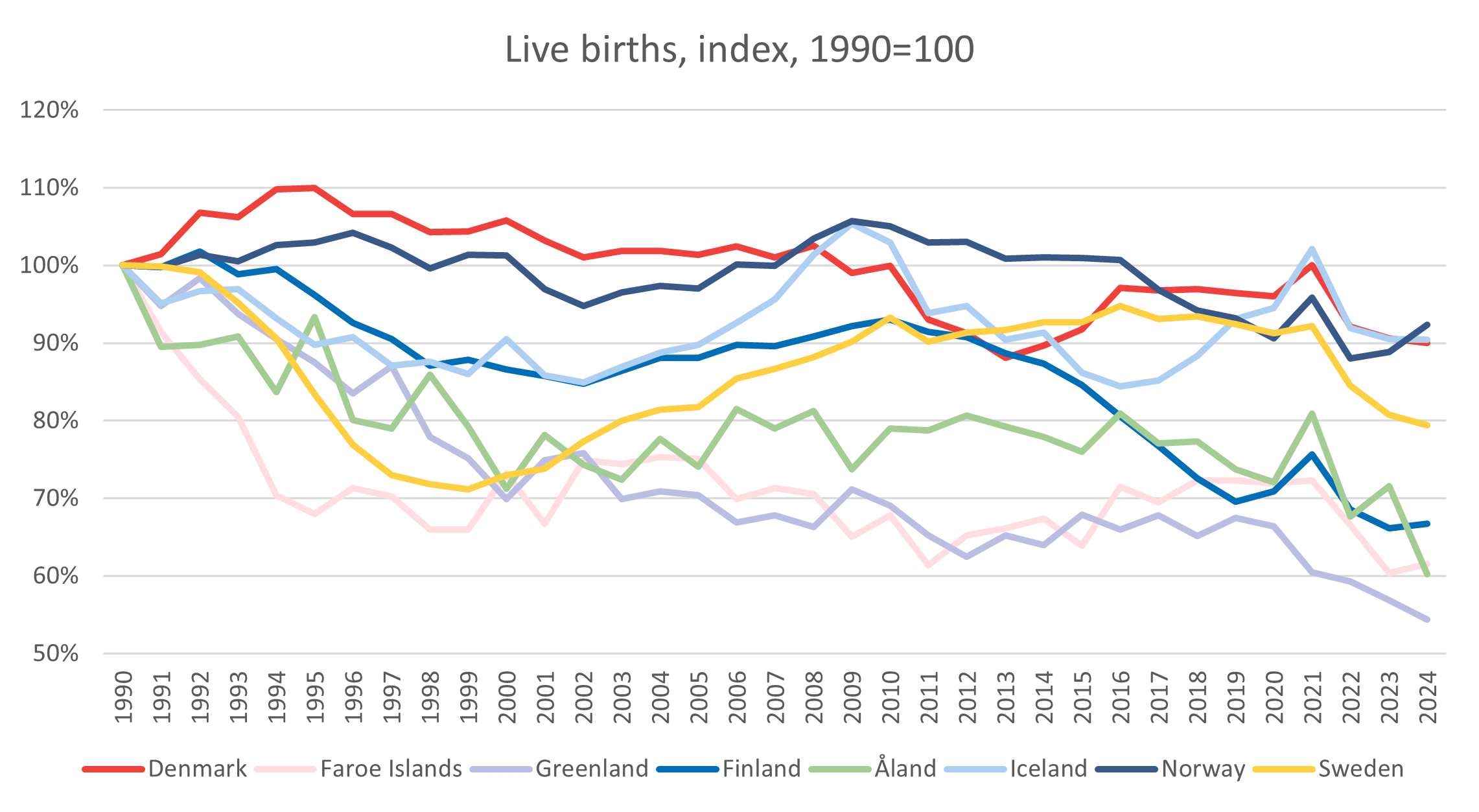 Over the past decades, the number of (live) births has decreased in all 8 Nordic countries. In 2024, a total of 259,000 children were born in the 8 Nordic countries, which is -19% compared to 1990 and only 300 children up from the record low number of 2023. At the country level, the decreases vary between -8% in Norway and -46% in Greenland.