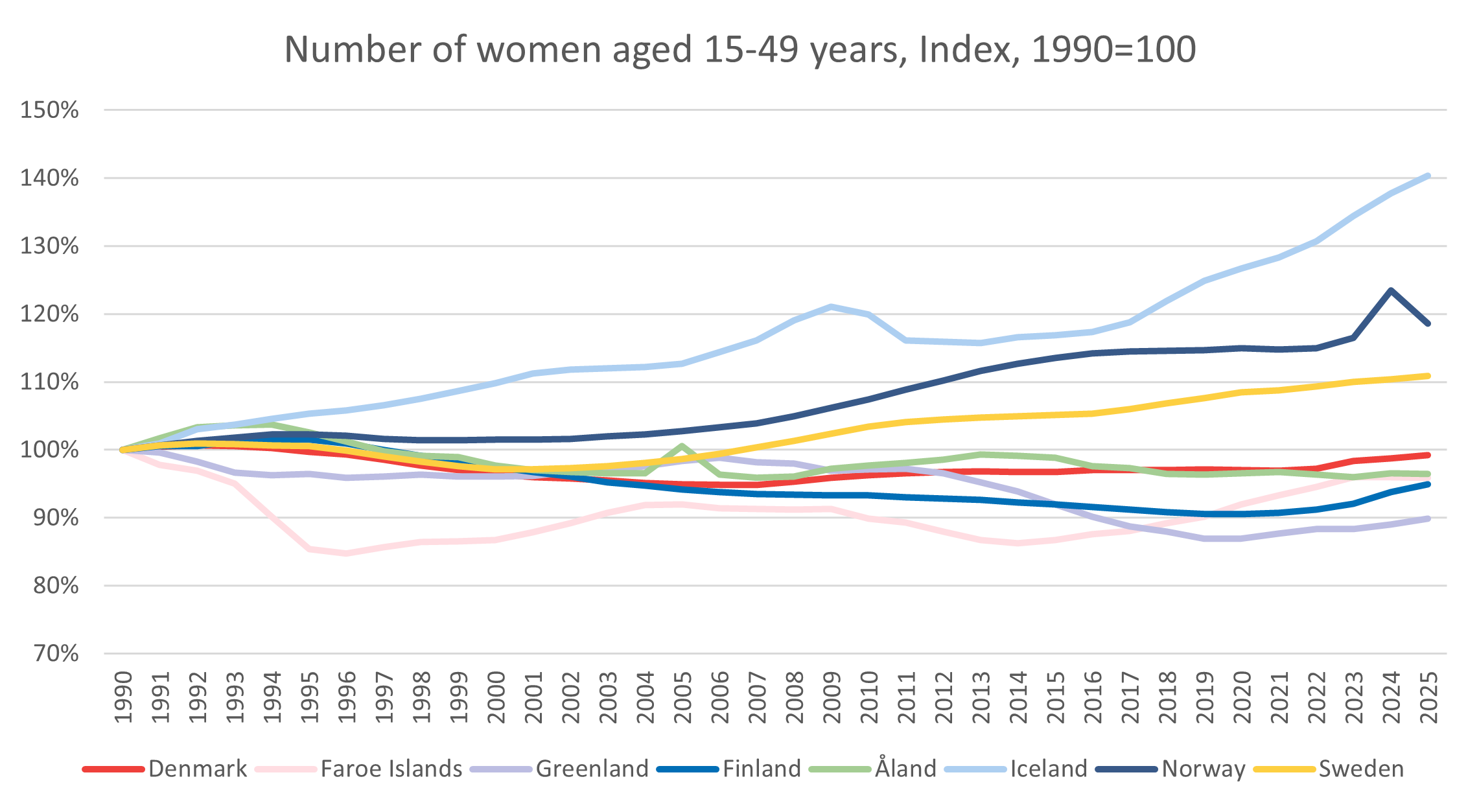 In Faroe Islands, Finland and Åland there were around 5% less women of fertile age in 2025 than in 1990. This reinforced the effect of the declining fertility (-32%, -30%, -36%), resulting in a larger decline in births (-38%, -33%, -40%).
