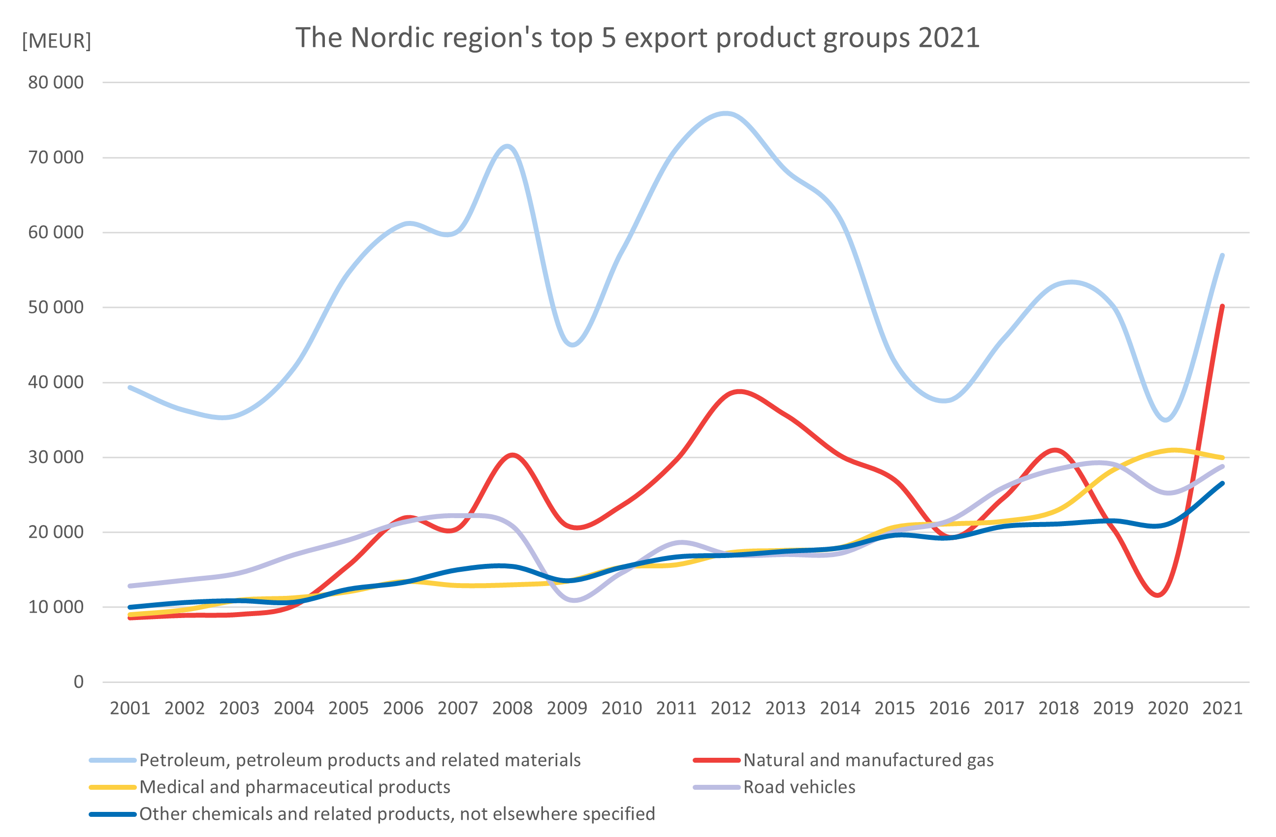 Medical and pharmaceutical products, Road vehicles as well as Other chemicals and related products not elsewhere specified are also important export products for the Nordic region. Denmark accounted for 61 percent of exported Medical and pharmaceutical products in 2021, and Sweden for 71 percent of Road vehicle export. In the same year Sweden accounted for 45 percent and Finland for 25 percent of Other chemicals and related products, not elsewhere specified.