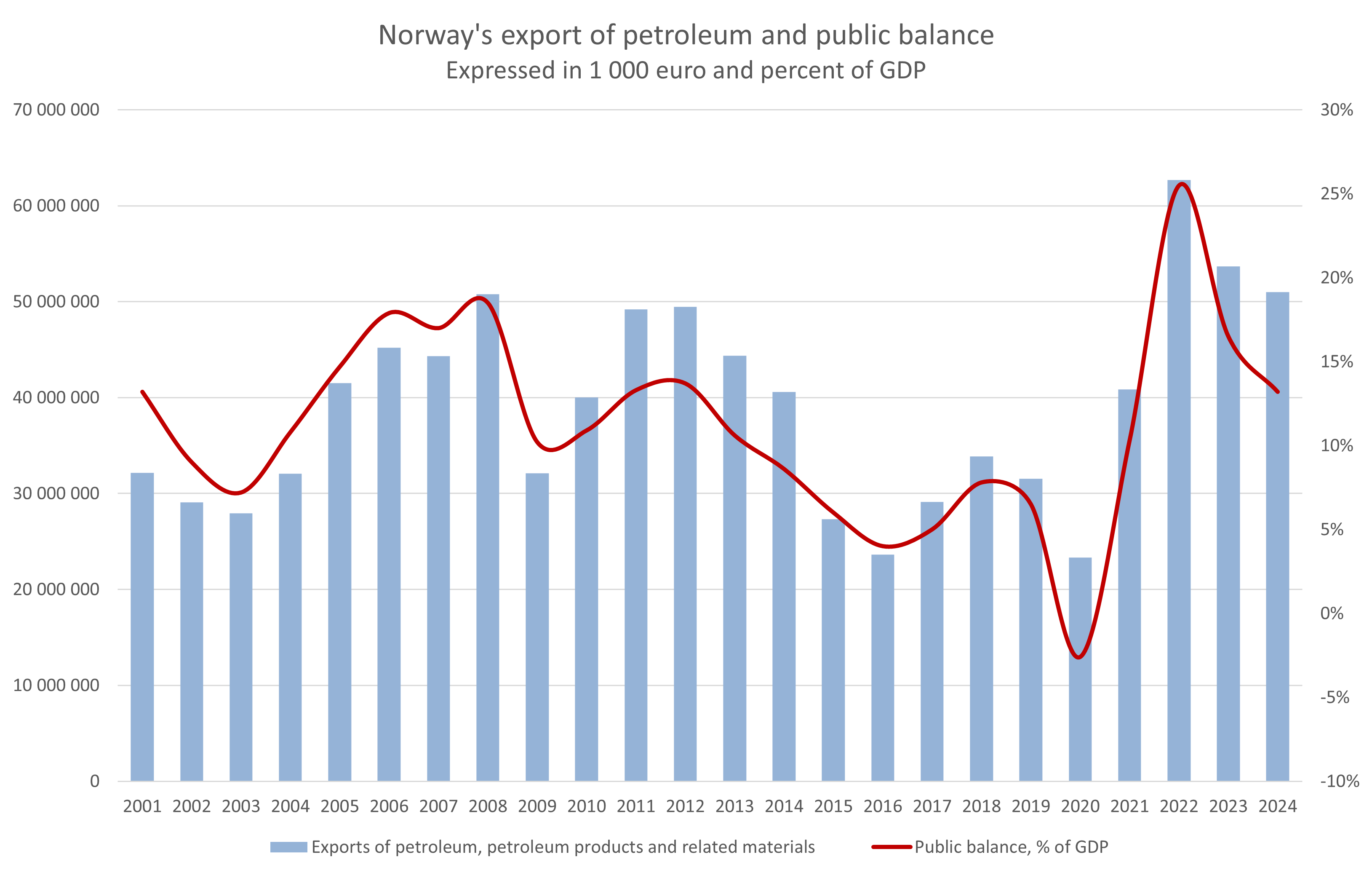 In Norway, the fluctuation in public balance is highly connected to the petroleum sector and exports of oil and natural gas. In the figure below, Norway’s exports of petroleum products are displayed in 1 000 euros together with the country’s public balance. The fluctuations in exports and public balance displays a similar pattern. When the export value of petroleum products increases or decreases, the public balance tends to follow. This can especially be seen during the peak of 2022, when Russia’s invasion of Ukraine led to high prices on natural gas which Norway exported to higher revenues [1]. These additional revenues are subsequently reflected in the public balance.