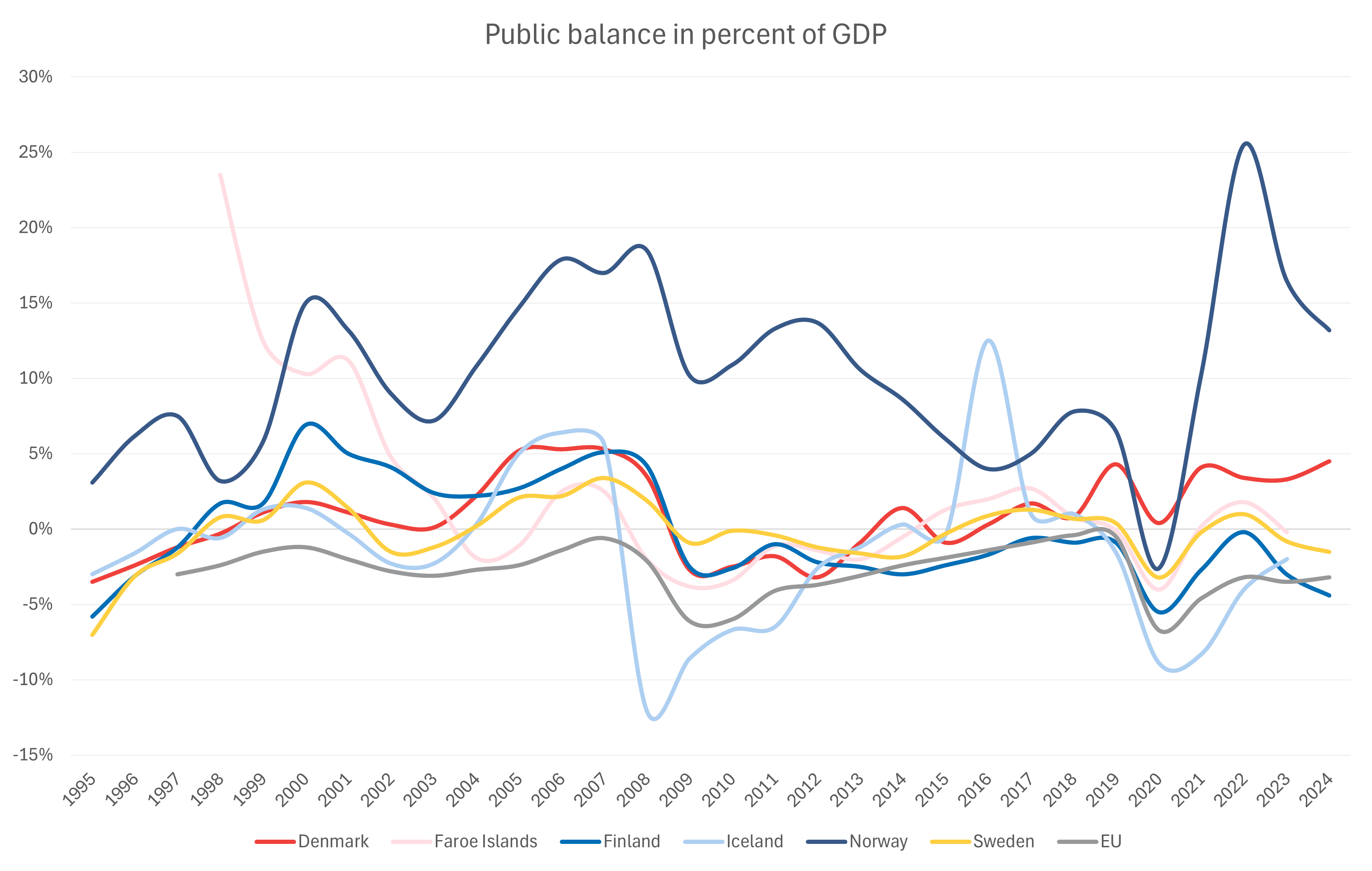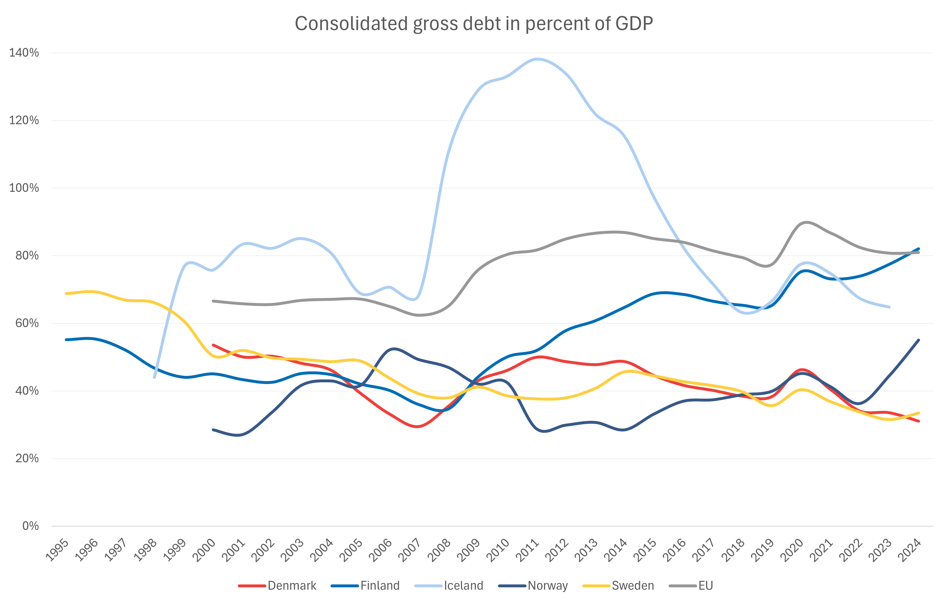 In summary, Norway consistently demonstrates strong fiscal performance, largely driven by petroleum exports. In contrast, Finland has struggled with persistent deficits since the financial crisis, reflected in its growing consolidated gross debt, surpassing the EU average in 2024. Overall, the Nordic countries exhibit healthier public finances than the EU, despite considerable fluctuations tied to global economic events.