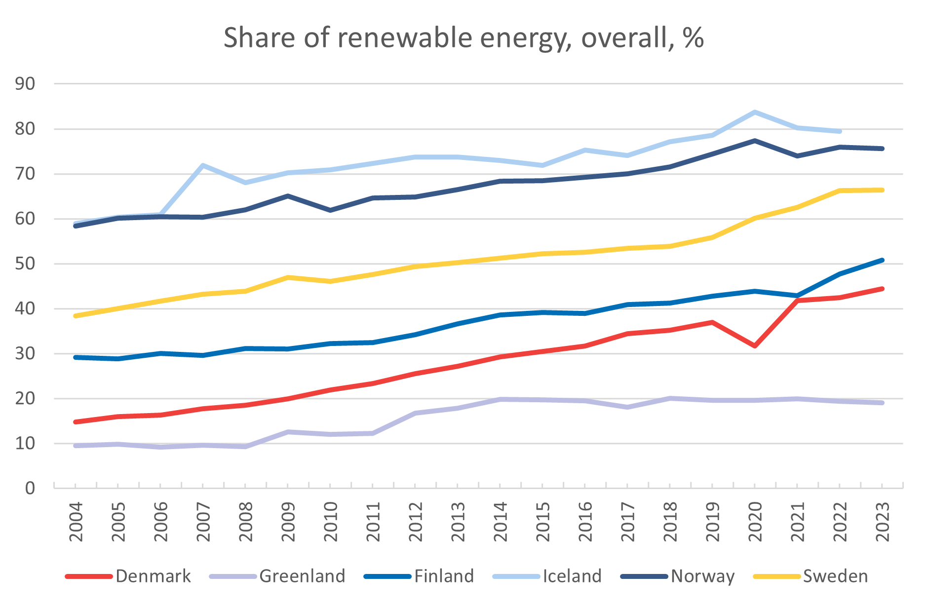 In 2004, shares of renewables in the gross final energy consumption [2] varied greatly in the Nordic countries, between 9,5 percent in Greenland and 58,9 percent in Iceland. In 2023, these shares had increased to between 19,1 percent in Greenland and 79,5 percent in Iceland (2022 value, 2023 not yet available for Iceland).
