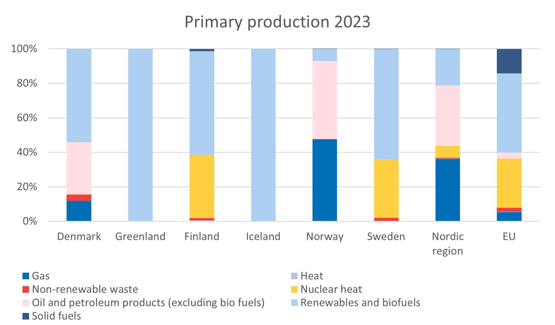 All countries except Norway had renewable energy sources accounting for 54 percent or more of the primary production in 2023. Greenland and Iceland exclusively produced energy from renewable sources, Hydropower in Greenland and Geothermal energy and Hydropower in Iceland. Renewable wastes and biofuels were the largest sources of renewable energy in Sweden, Finland, and Denmark, while Hydropower was the largest in Norway.