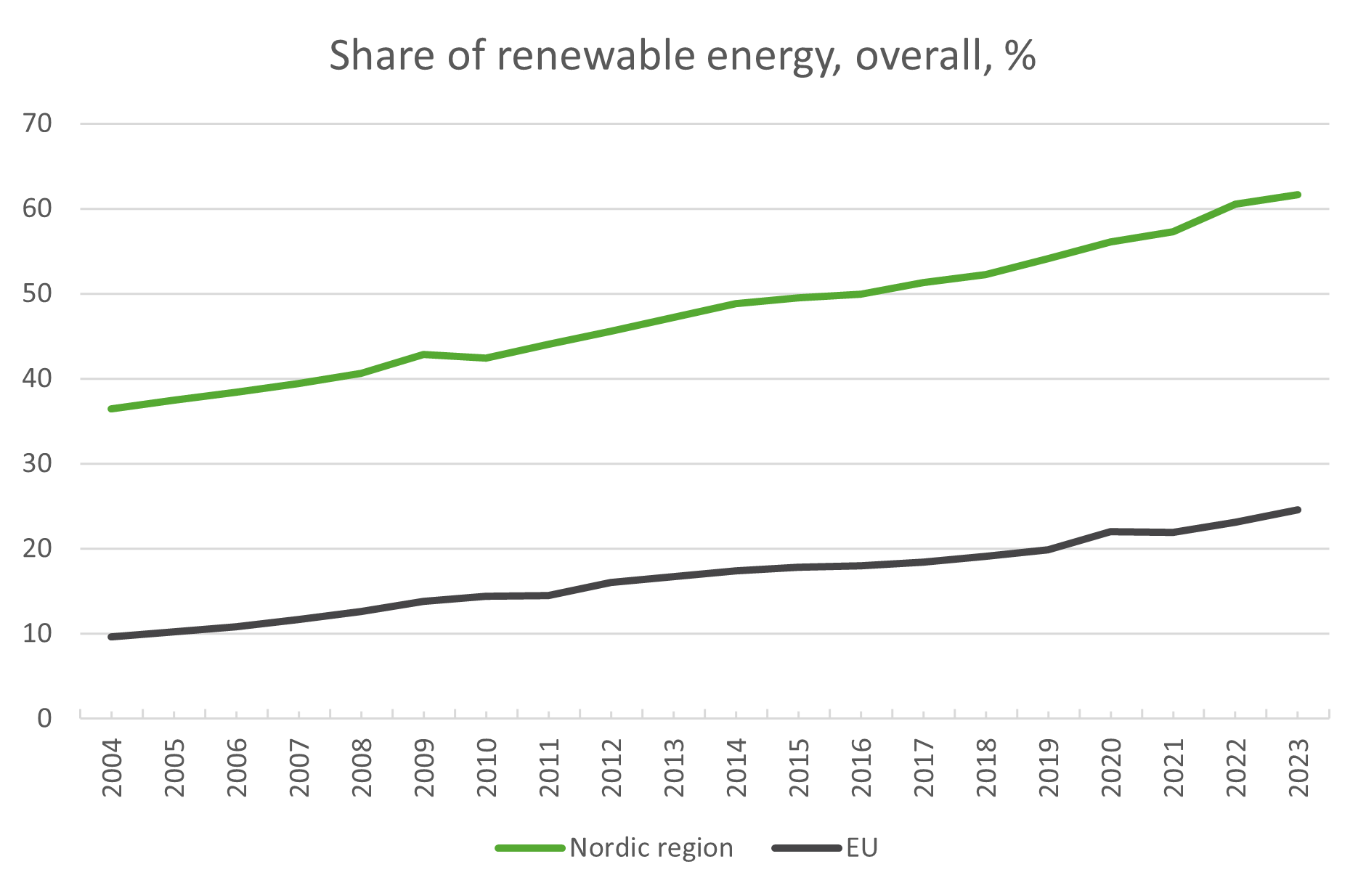 When the country values are combined into a Nordic value [4], the difference between the Nordics and the EU is clear. The EU reached a 24.5 percent share of its gross final energy consumption from renewable sources in 2023, 2.5 times higher than in 2004 when it was 9.6 percent. The Nordics started at 36.4 in 2004 and reached a 61.6 percent share in 2023, a value 1.7 times higher.