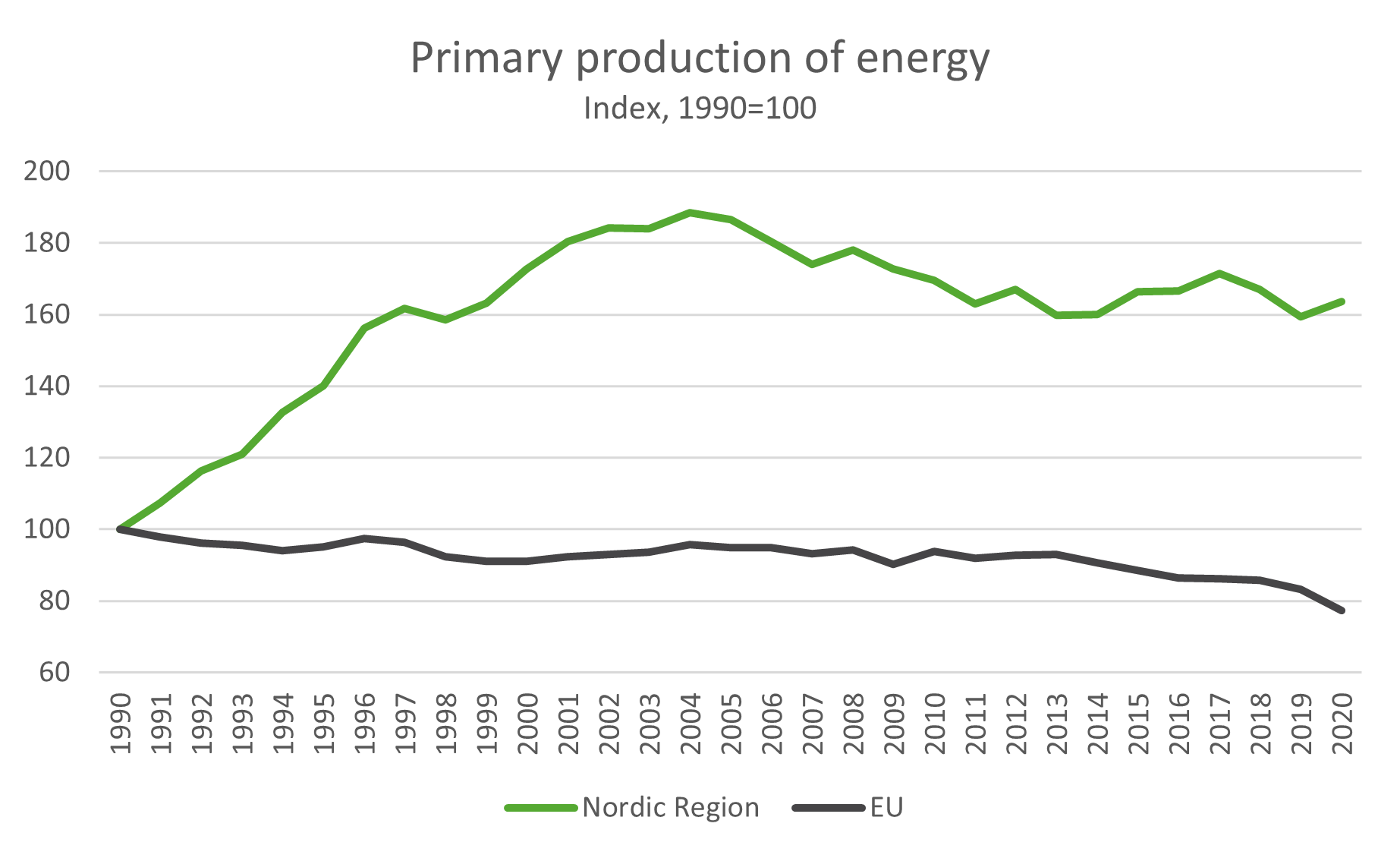 The primary production of energy in the Nordic countries rose considerably during the 90s, primarily due to the Norwegian oil deposits in the North Sea. At the same time the production in the EU as a whole fell. Since Norway is not a European union member, this increase is not reflected in the figures for the EU.