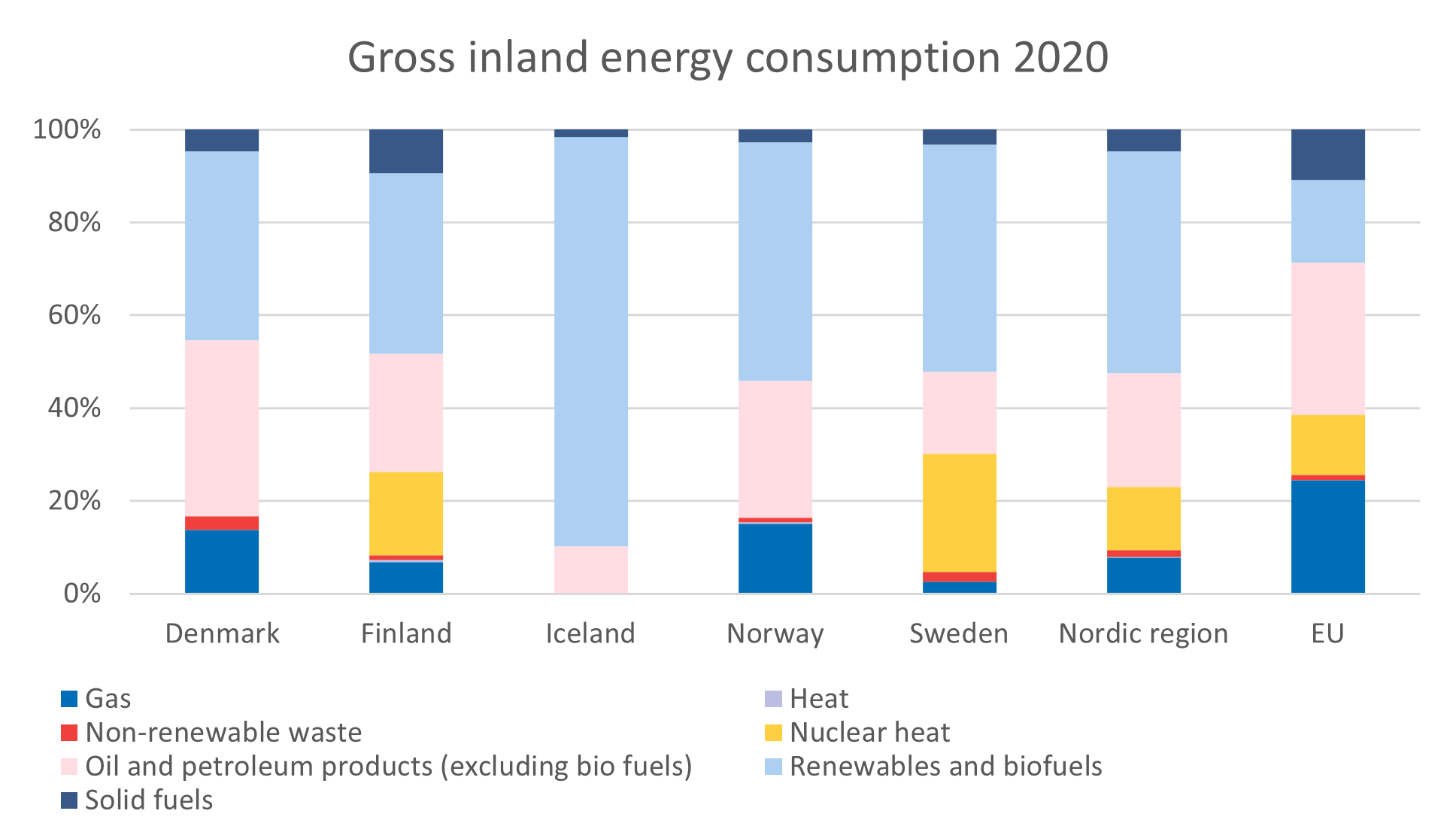 The combined gross inland energy consumption [4] of the Nordic countries, Faroe Islands excluded, was just under 130 million tonnes oil equivalent in 2020 [1]. This equals just under 10 percent of the gross inland energy consumption in the EU. The largest source of energy in the Nordic region in 2020 was Renewables and biofuels, with almost half of the energy consumed coming from this source. Oil and petroleum products accounted for a quarter of the consumption, and Nuclear energy for 13 percent. Compared to the EU the Nordics consume more Renewables and biofuels and less Gas. The latter can be seen as a strength considering ongoing developments.