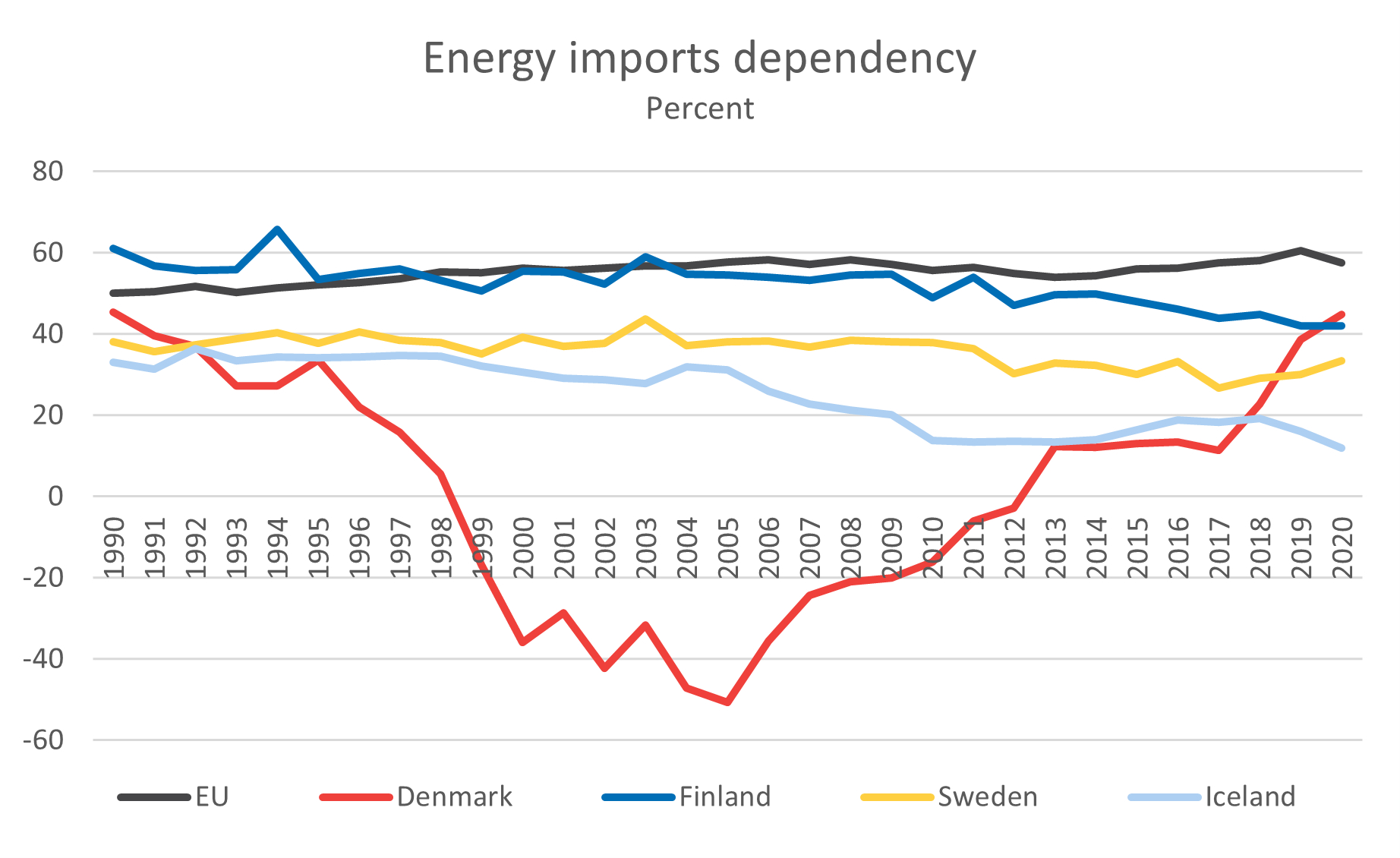 In the Nordic countries, excluding Norway, the energy imports dependency rates today are positive and varies between 12 (Iceland) and 45 percent (Denmark) in 2020. Denmark stands out in the sense that they had negative values, i.e., they were net exporters of energy, between 1999 and 2012. Since then, they have brought an immediate end to new oil and gas exploration in the Danish North Sea as part of a plan to phase out fossil fuel extraction by 2050. Compared with 1990 their rate is on the same level today. The Icelandic rate has decreased by two thirds since 1990, the Finish rate by one third and the Swedish by 12 percent.