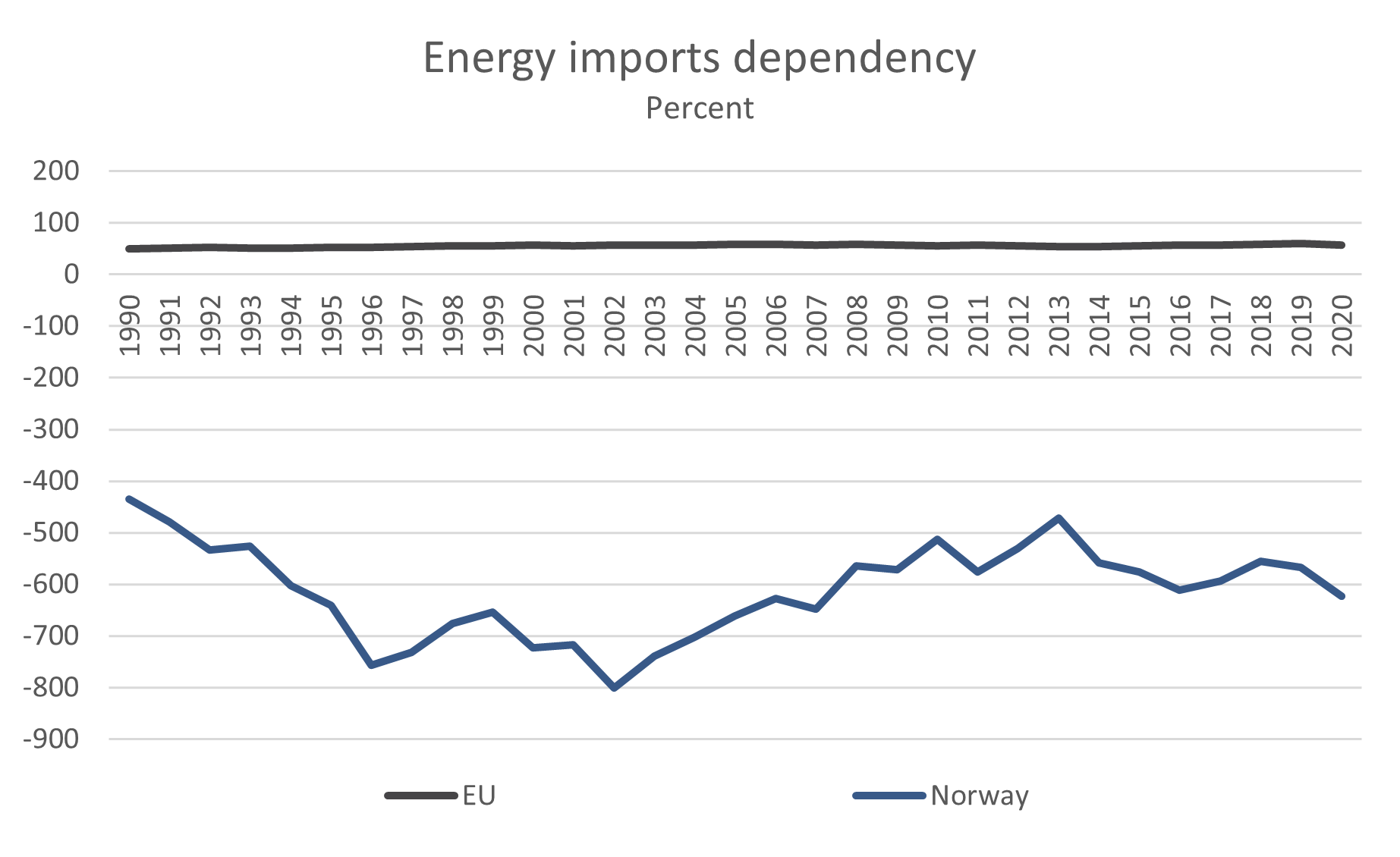 Norway stands out in its role as a major producer of energy, they have been large-scale net exporters throughout the period. In 2020 they exported six times more energy than they consumed, but the rate was as low as -800 percent during parts of the 90´s and early 00´s.