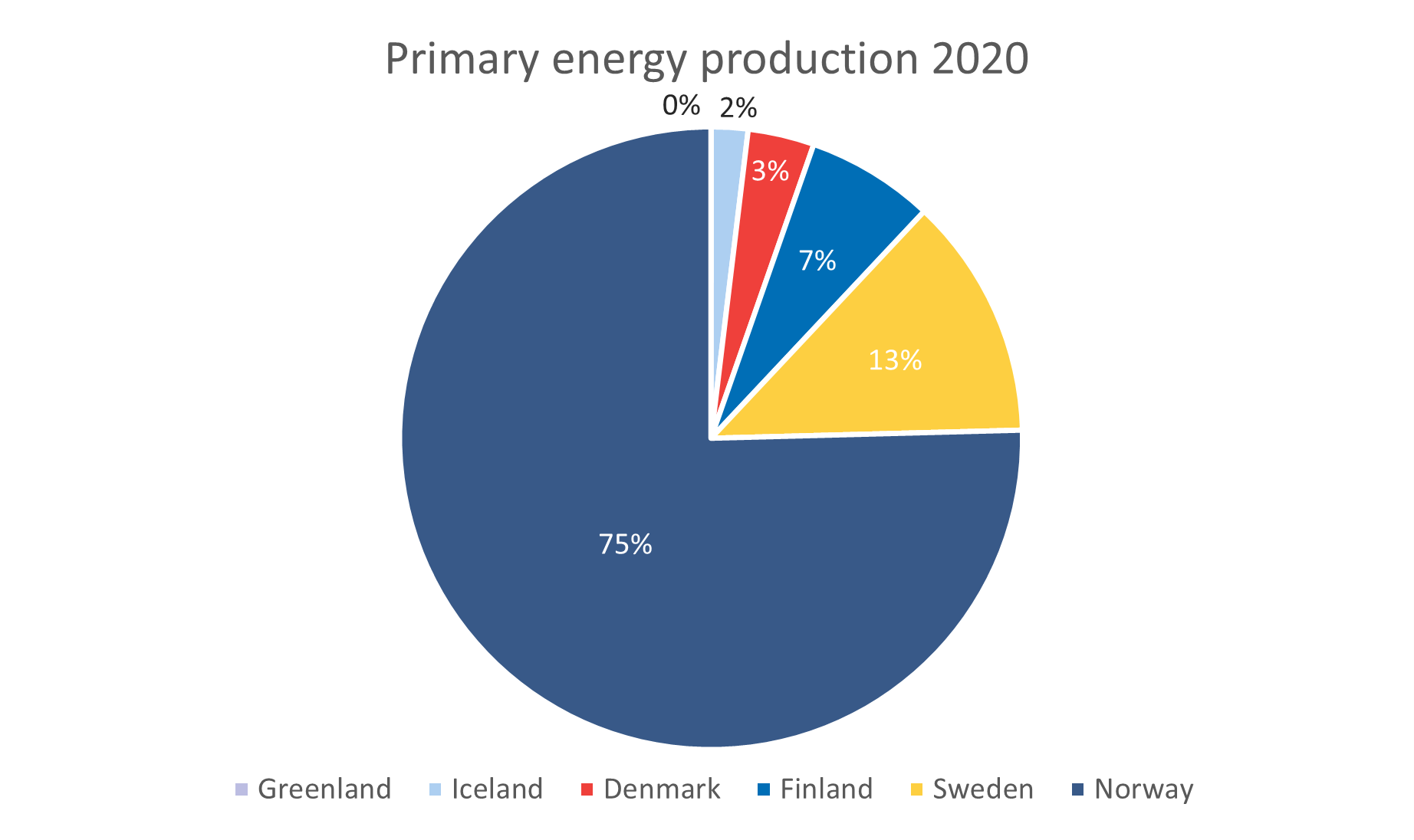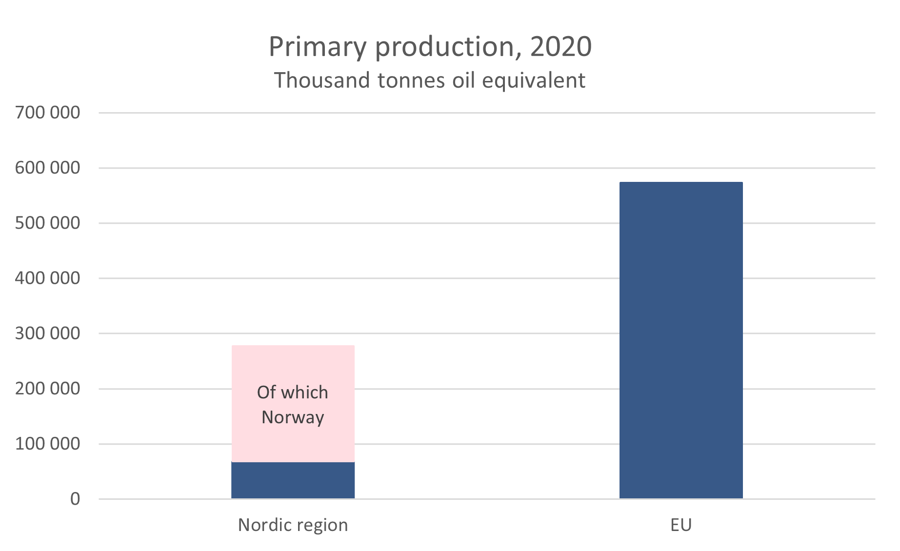 In 2020, the Nordic countries produced 280 million tonnes oil equivalent of energy [1]. This equals 48 percent of the total primary production [2] of energy in the European union (EU27_2020). In 1990 the energy produced in the Nordic region equalled 23 percent of that of the EU [3].