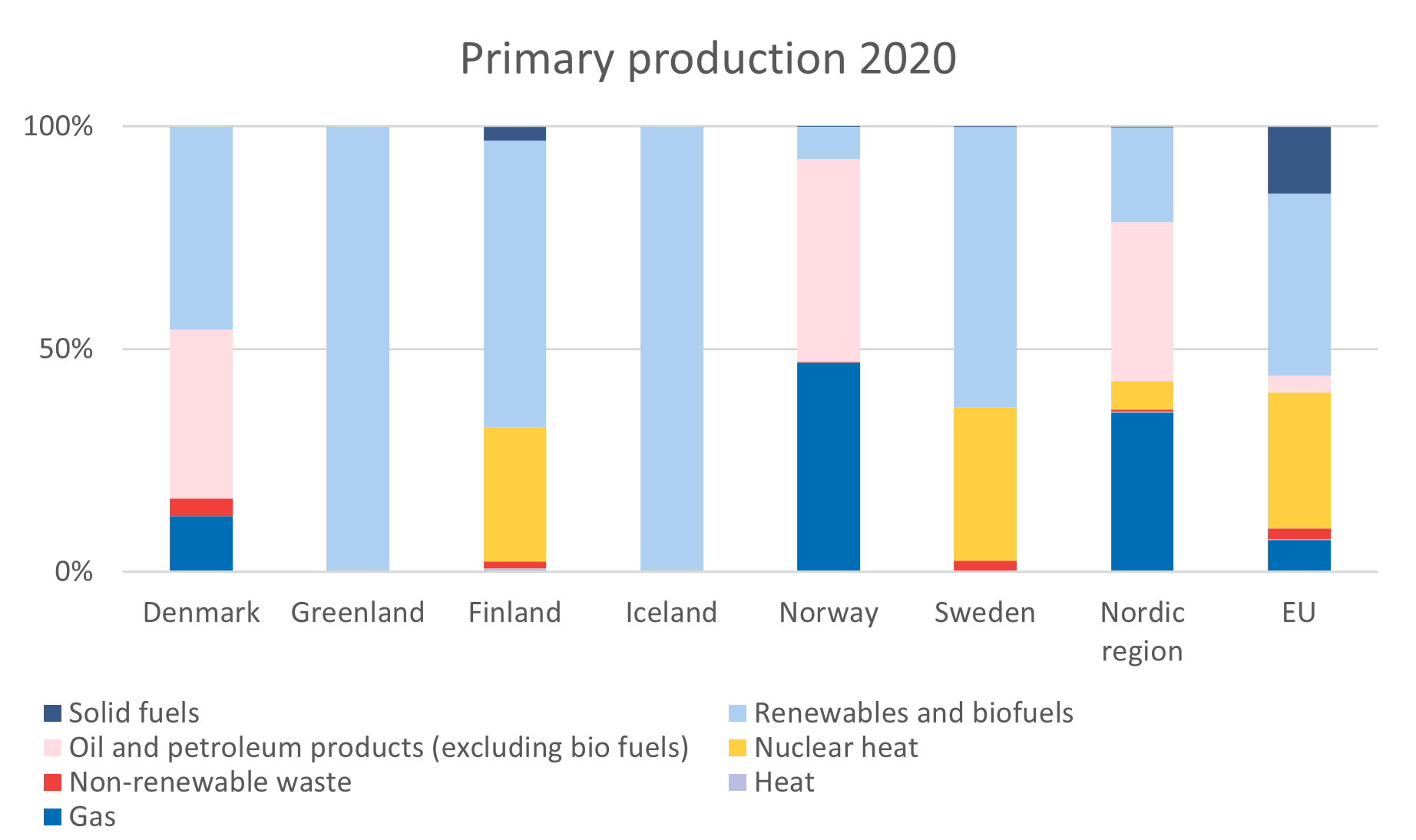 When analysed by country it is evident that Renewables and biofuels are very important to the Nordic region. The large primary production of Oil and petroleum products and Gas in Norway dominates the Nordic picture. However, it is important to note the fact that all other countries included individually have renewable energy sources accounting for 45 percent or more of the primary production. Greenland and Iceland exclusively produce energy from renewable sources, Hydropower in Greenland and Geothermal energy and Hydropower in Iceland. Renewable wastes and biofuels are the largest sources of renewable energy in Sweden, Finland and Denmark, while Hydropower is the largest in Norway.