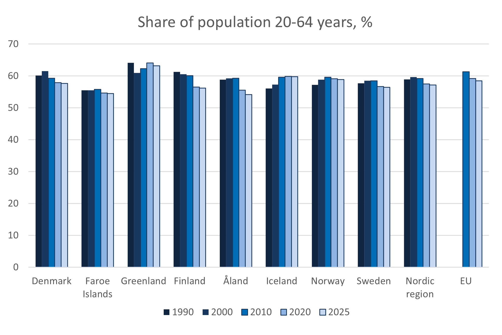 The development of the share of people of working age, 20-64 years is a bit more diverse. In the Nordic region, the group has decreased by -3% since 1990. In Finland, it has decreased by as much as -8% in the same period, while it has increased in Norway (3%) and Iceland (7%).