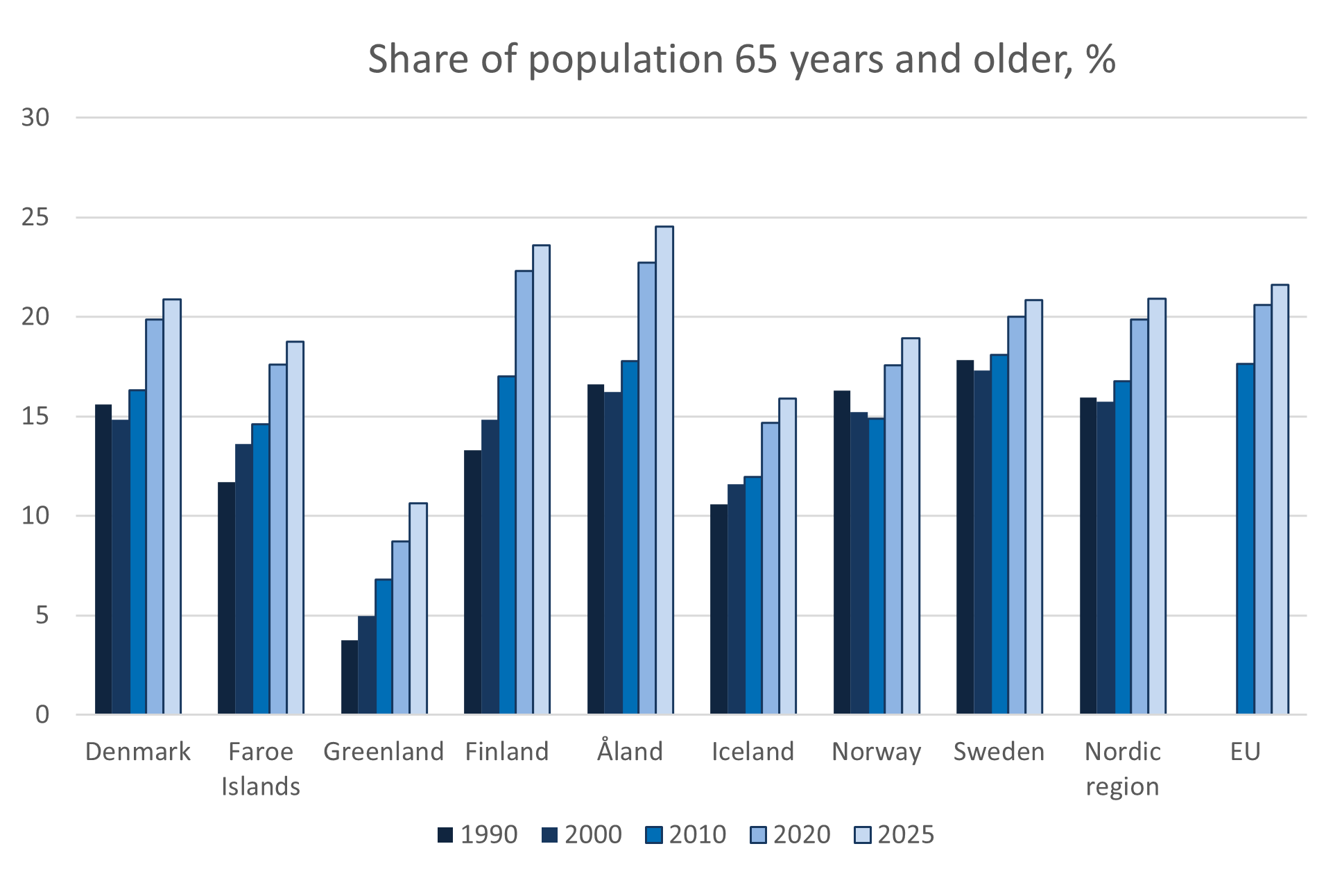 The share of people aged 65 years or older is often the focus when population structure is analysed. In the Nordic region, this group has increased by 31% since 1990. In the eight countries, increase varies between 16% in Norway and 184% in Greenland (starting from a very small share of 3.7% in 1990). Of the five larger countries Finland has the largest increase, 77%.