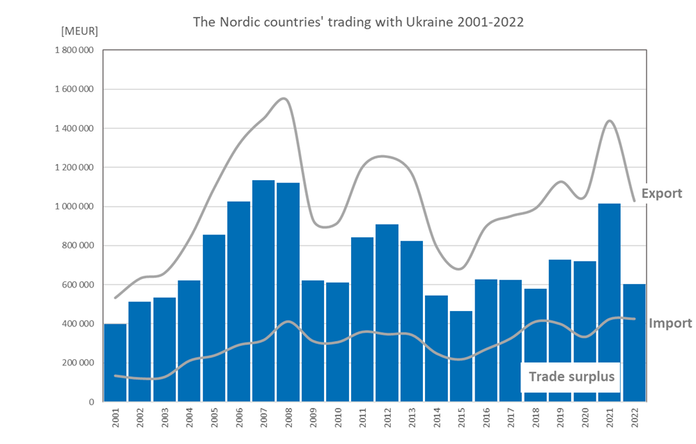 The trade values between the Nordic region and Ukraine are lower than those with Russia, in terms of economic value about a tenth. In 2022, a total of 1 billion Euro worth of goods were exported to Ukraine and just over 0.4 billion worth were imported from Ukraine. Compared with previous years these are relatively normal figures. There is a drop in export value to Ukraine compared to the previous year, but the 2022 value was unusually high so it is hard to say if this is a drop caused by the war or a return to normal values. The invasion may have affected the willingness of other countries to import from Ukraine positively, but it has also strongly affected the possibilities for Ukraine to deliver goods abroad.