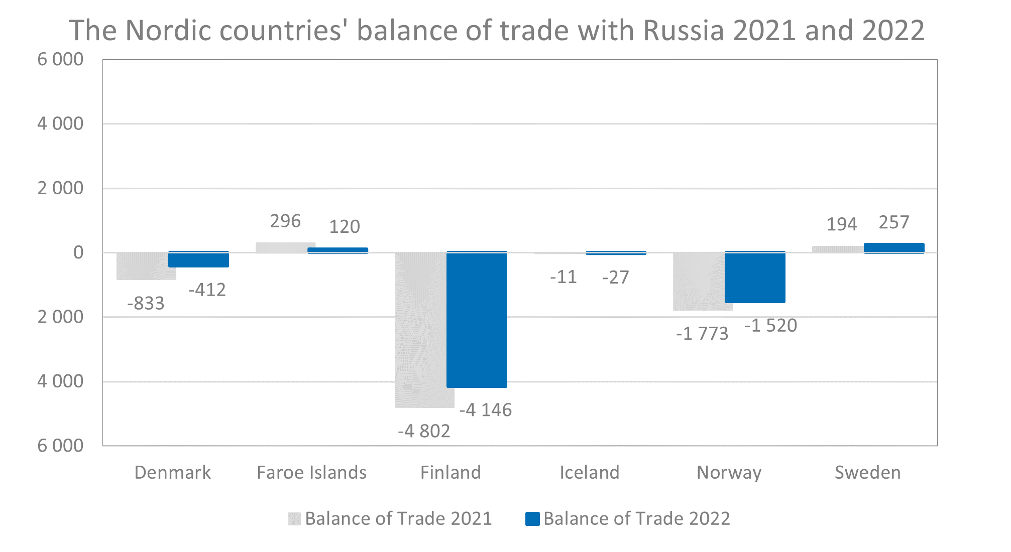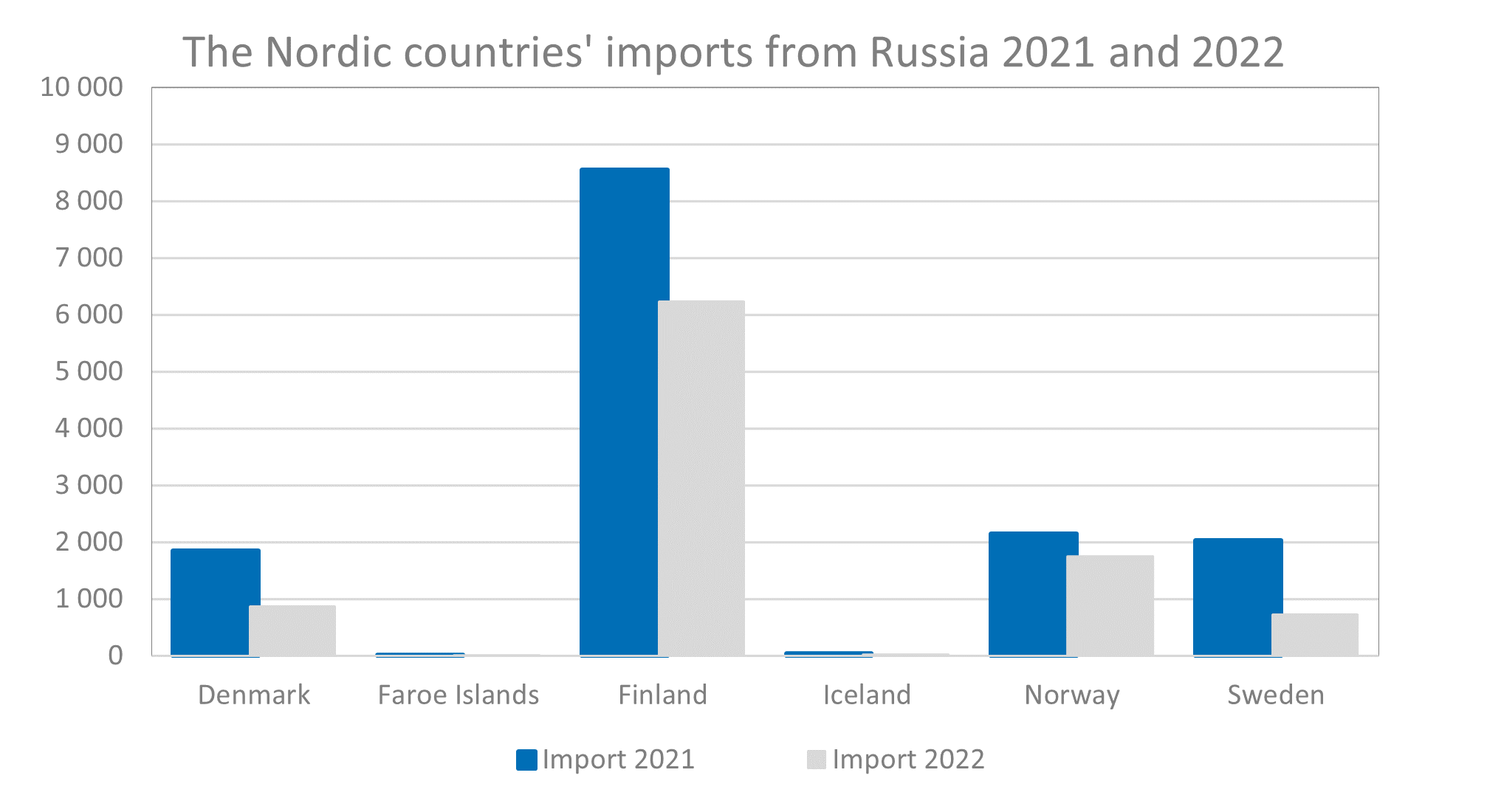 Compared with 2021 imports were down for all countries, with drops varying between 64 percent in Sweden and 10 percent in Faroe Islands. The total value of all imports from Russia in 2022 was 9.6 billion, which is a decrease by 34 percent compared to 2021.