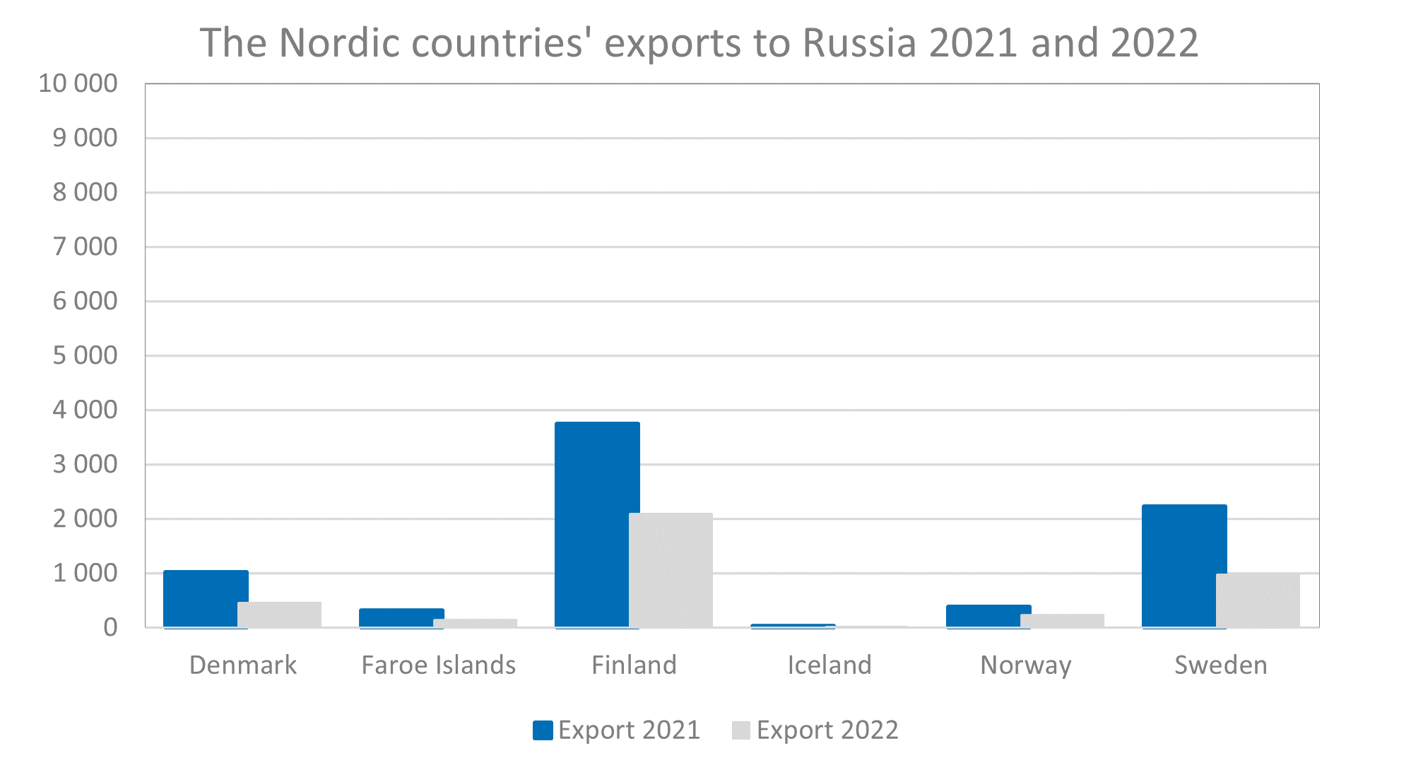 Exports were similarly down, with drops varying between 93 percent in Iceland and 39 percent in Norway. The total value of Nordic exports to Russia in 2022 was 3.9 billion, a decrease by 50 percent compared to the previous year.