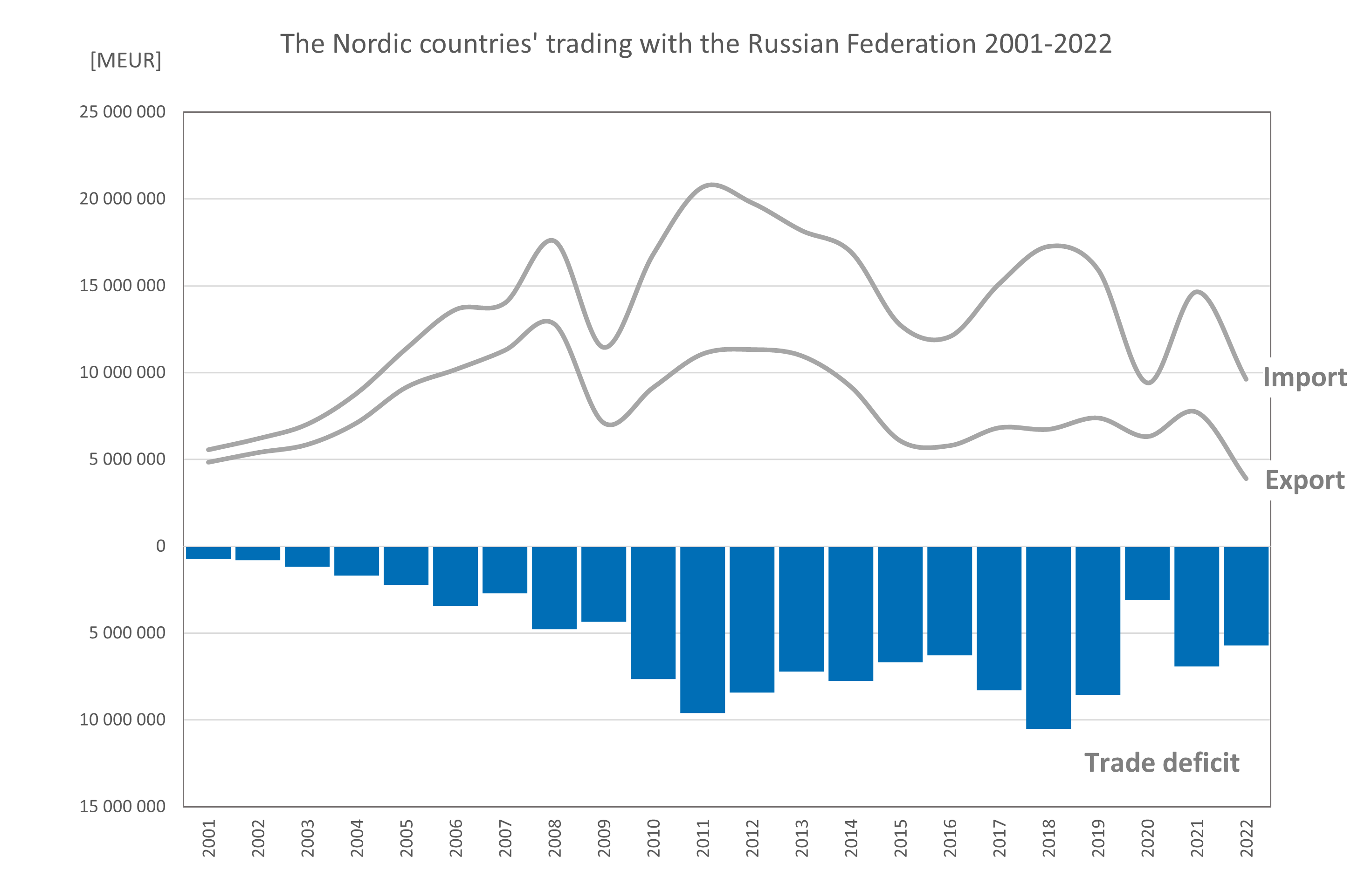 The Nordic region’s trade with Russia has varied over the past twenty years but has always resulted in a trade deficit. In 2022, a possible shift in trade values can be seen. Both import and export decreased, although the trade deficit remained.