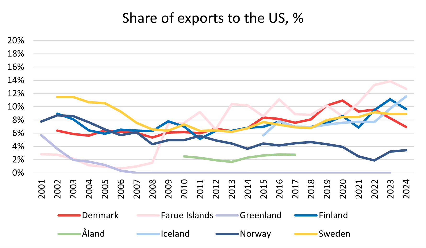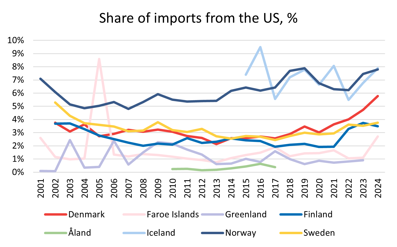 The shares of trade with the US are, at a first glance, more volatile than those with for example Russia. Shares of import from the US varies between 3 and 8% of the total value of imports in the Nordic countries in 2024.