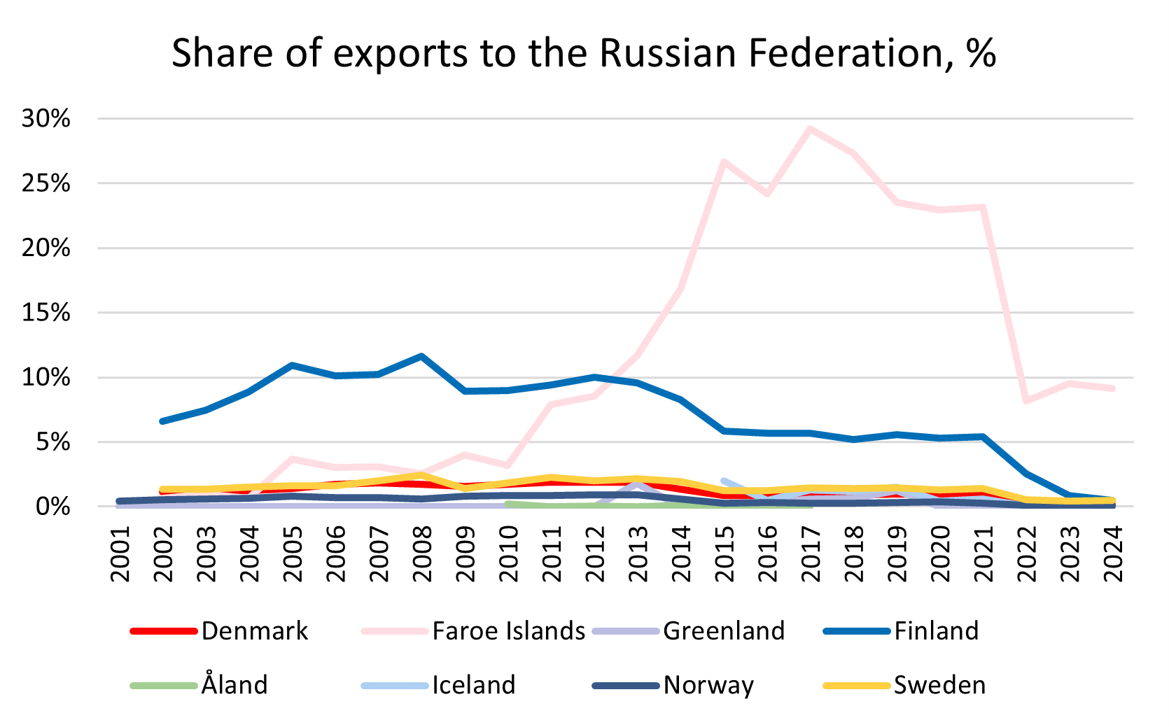 When it comes to exports to Russia, the picture is quite similar as for imports. Most of the Nordic countries had exports to Russia accounting for between 0 and 2% of the total value of exports between 2001 and 2021. Finland had a higher level during the whole period, between 5 and 12%, but the big exception here is Faroe Islands. In the beginning of the reported period, their exports to Russia were low, varying between 0 and 4%. In 2011, it started to increase and in 2017 it peaked at 29%. It then remained at levels around 23% before it dropped to 8% in 2022.