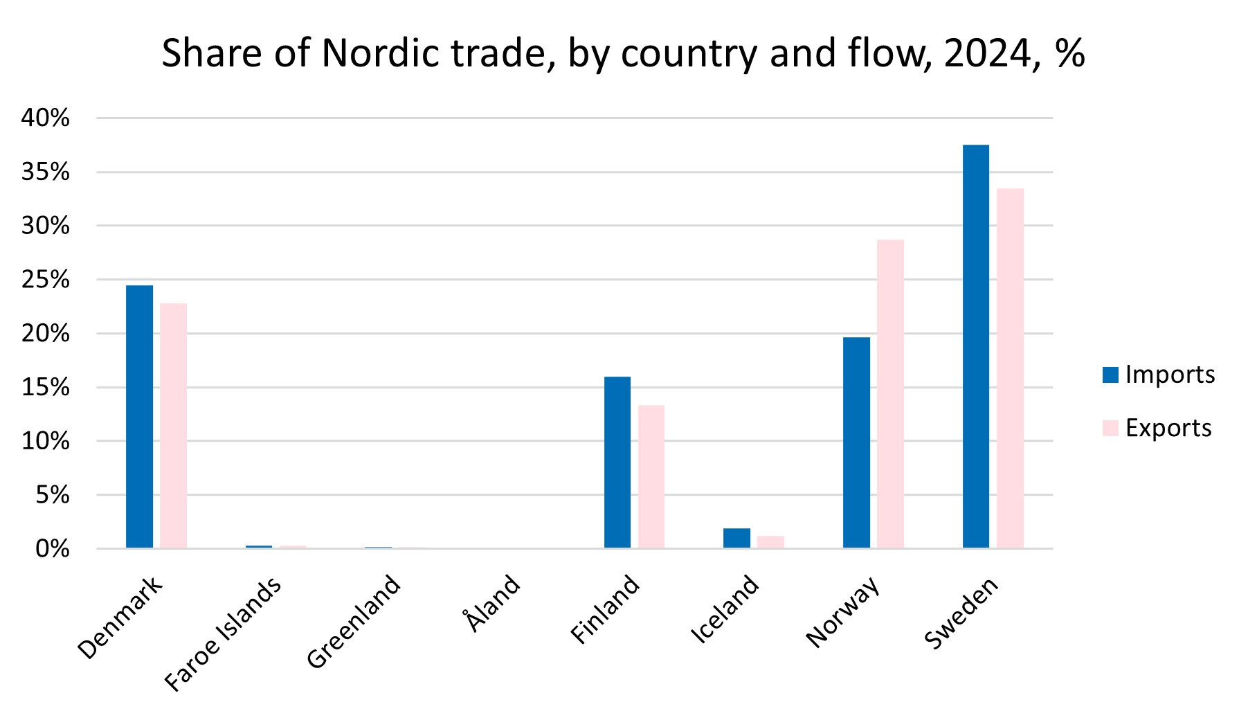 Norway had the second largest export value, 29% of the total value of all exports to the Nordic region in 2024. Denmark came in third with 23%, Finland fourth with 13% and Iceland fifth with 1%. As with imports, Faroe Islands, Greenland and Åland had export values corresponding to less than 0.5% of the total Nordic export value in 2024.